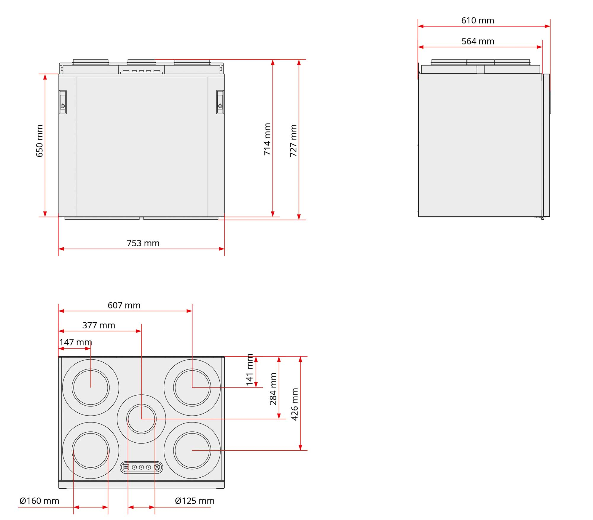 - Ilmamäärät: Tulo 130 dm³/s (100Pa), Poisto 130 dm³/s (100 Pa)