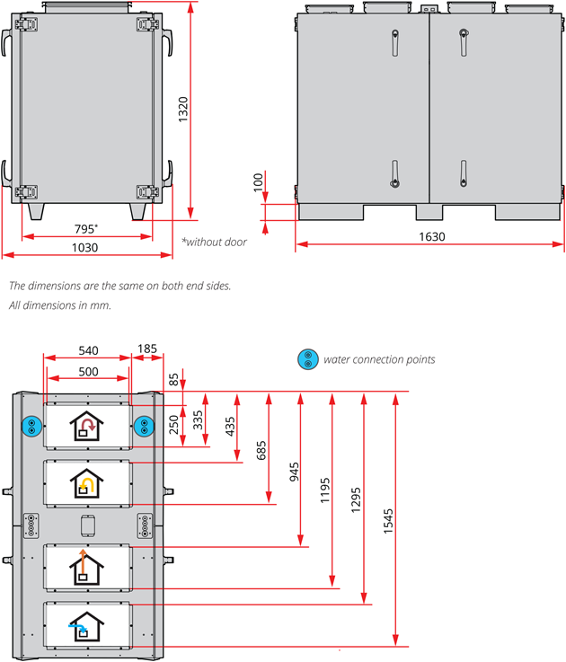 Laite toimitetaan oikeanpuoleisena mallina, joka on helppo muuttaa asennuskohteessa vasemmanpuoleiseksi. Vesikiertoinen jälkilämmityspatteri on tilattavissa erikseen, ja se on helppo asentaa tai vaihtaa asennuskohteessa. Muunneltavuus takaa turvallisen ja nopean toimituksen sekä vähentää kustannuksia mahdollisten muutosten yhteydessä.