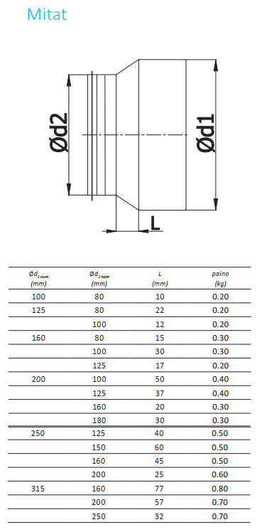 Heatco MYN-muuntoyhde kanavalle on varustettu EPDM-tiivisteillä kummassakin päädyssä. Heatco MYNO-muuntoyhde osalle on varustettu EPDM-tiivisteellä kanavakooltaan pienemmässä päädyssä.