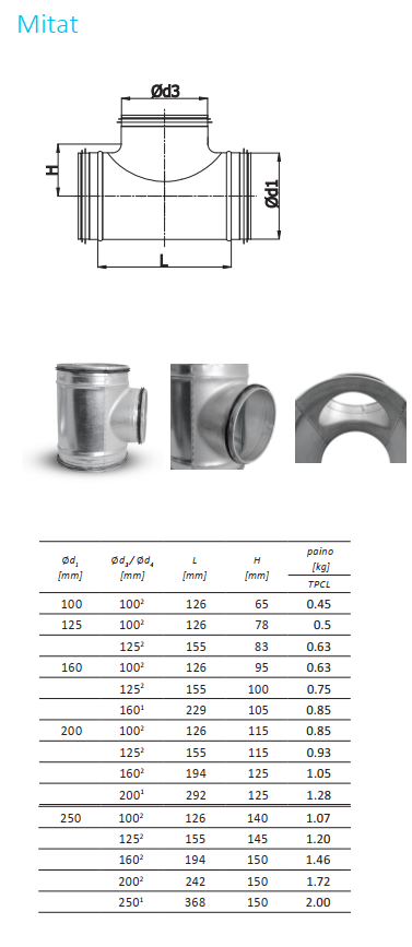T-yhteitä löytyy kanavakoossa ø100-250mm.
