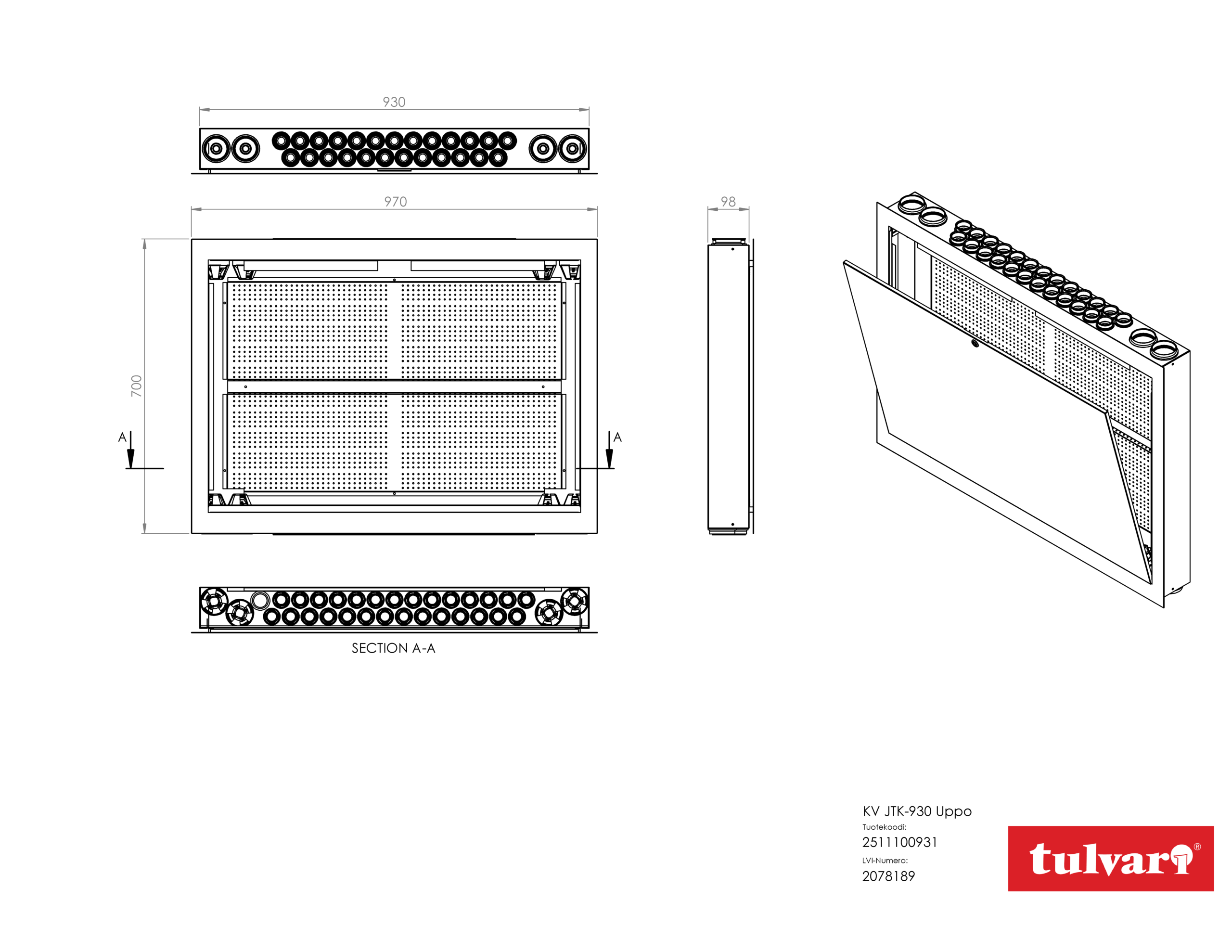 Suomessa valmistettu vesitiivis käyttöveden jakotukkikaappi. Valmistettu 0,6 mm vahvasti sinkitystä pellistä.